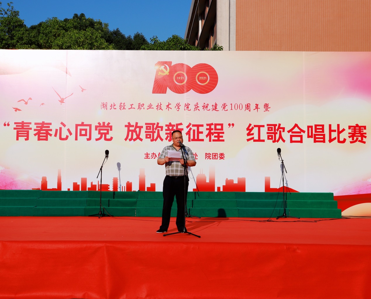 (校团委 讯 )为庆祝中国共产党成立100周年,传承红色基因,赓续红色血脉,深化爱国主义教育,6月22日下午,校团委主办的“青春心向党,放歌新征程”——庆祝中国共产党成立100周年红歌合唱比赛在校篮球场隆重举行。学院党委书记、院长徐兵同志,纪委书记罗代吕同志,院长助理祁旭东同志,学工处处长刘欢同志以及各院系学生工作负责人和参赛队伍共计500余人参加本次活动。