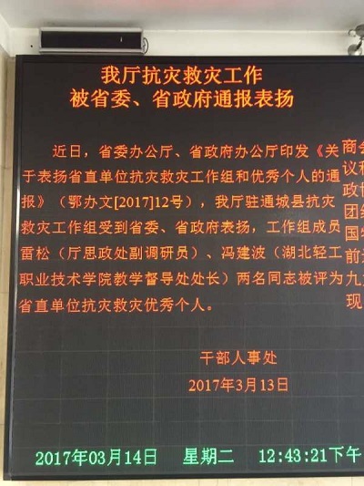 (党委宣传部 林亚正3月14日讯)省委、省政府办公厅近日印发《关于表扬省直单位抗灾救灾工作组和优秀个人的通报》(鄂办文【2017】)12号),省教育厅驻通城县抗灾救灾工作组受到省委、省政府表扬,工作组成员、我院教学督导处处长冯建波同志被评为省直单位抗灾救灾先进个人。