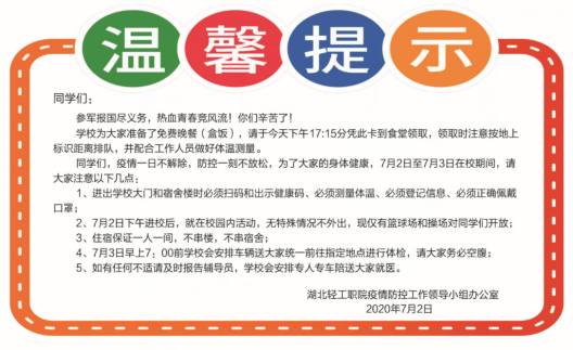 截止7月2日下午,共计 90余名学生返校,由于事情繁琐,工作量大。既要照顾到学生的实际情况,又要考虑疫情防控需要,学校疫情防控工作领导小组办公室的全体成员和各岗位工作人员,冒着暴雨主动做学生的“搬运工”和“指路人”,全程无缝为学生提供帮助,解决了学生的实际困难,让整个返校工作平稳有序。