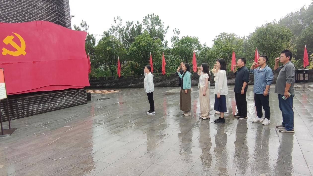 “我志愿加入中国共产党,拥护党的纲领,遵守党的章程……”在大别山革命历史文化陈列馆前,面对鲜红的党旗,全体党员教师整齐列队,庄严地高举右手,铿锵有力地重温入党誓词,将共产党员的荣耀、责任和使命牢牢铭记在心中。高亢洪亮、震撼人心的誓言在陈列馆上空久久回荡。