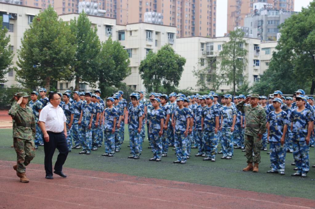 军训汇报暨开学典礼在雄壮的国歌声中拉开帷幕。指挥官报告受阅队伍列队完毕,校党委书记徐兵同志检阅新生方阵。